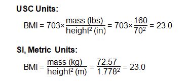 Below are the equations used for calculating BMI in the International System of Units (SI) and the US customary system (USC) using a 5’10”, 160-pound individual as an example: