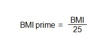 BMI prime is the ratio of a person’s measured BMI to the upper limit of BMI that is considered “normal,” by institutions such as the WHO and the CDC. Though it may differ in some countries, such as those in Asia, this upper limit, which will be referred to as BMIupper is 25 kg/m2.