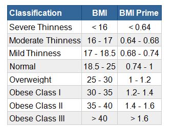 Since BMI prime is a ratio of two BMI values, BMI prime is a dimensionless value. A person who has a BMI prime less than 0.74 is classified as underweight; from 0.74 to 1 is classified as normal; greater than 1 is classified as overweight; and greater than 1.2 is classified as obese. The table below shows a person’s weight classification based on their BMI prime
