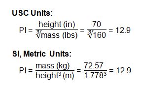 The Ponderal Index (PI) shares similarities with BMI. Both indices aim to measure the leanness and corpulence of a person based on the relationship between weight and height. The key difference to note is that the PI cubed the height while the BMI is squared (both calculations provided underneath). The BMI can be a useful statistic when thinking about large populations, but it cannot be trusted at an individual level to appropriately quantify leanness or corpulence in individuals. Even with these large population considerations, PI suffers similar short-comings, but it is more accurate to use with tall or short individuals, while BMI tends to record bizarrely high or low levels of body fat for those in the extreme ends of the physical height and weight continuum. Below is the equation for calculating the PI of an individual when using USC, using a person who is 5’10” and weighs 160lbs as an example: