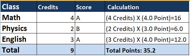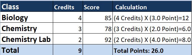 Sarah’s GPA: 34 total points ÷ 9 total credits = 3.77 GPA